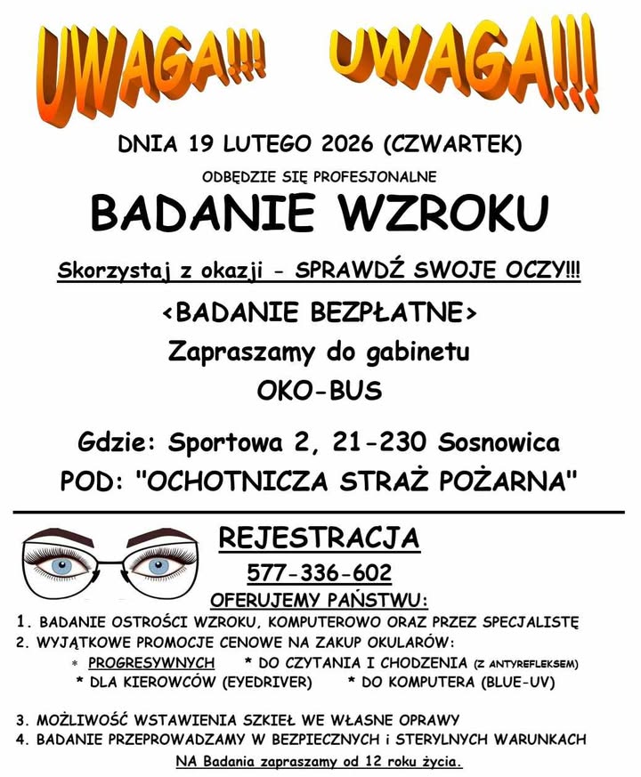 UWAGA MIESZKAŃCY! BEZPŁATNE BADANIE WZROKU 19 lutego 2026 r. (czwartek) [...]