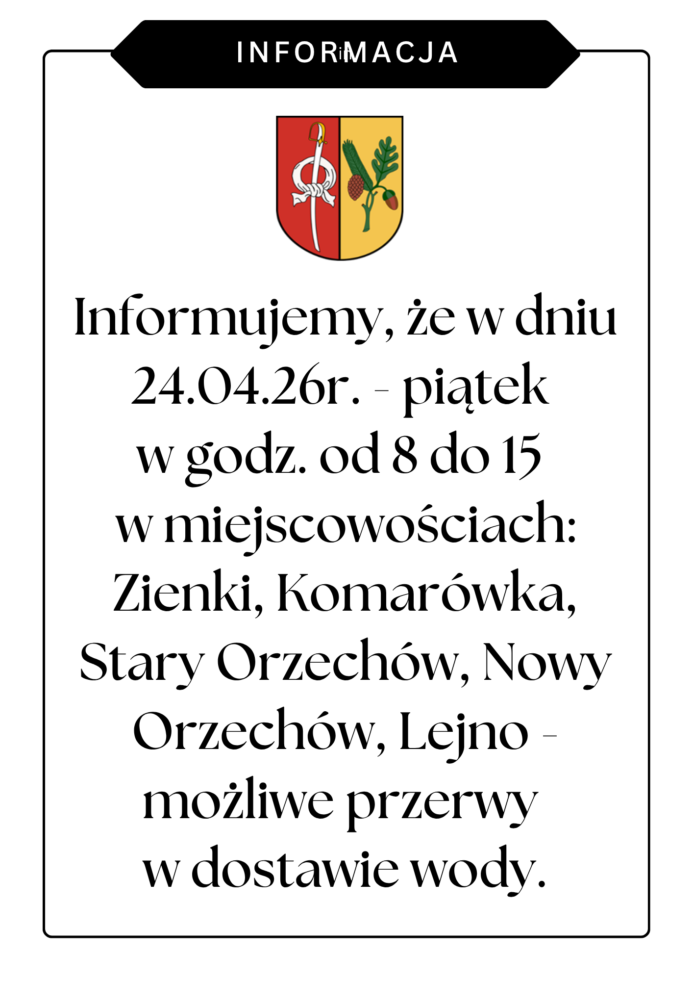 Informacja o przerwie w dostawie wody dnia 24.04.26r.