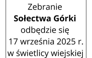 Informacja na temat zebrania sołeckiego – Zebranie Sołectwa Górki odbędzie się 17 września 2025 r. w świetlicy wiejskiej o godz. 17. Zapraszamy