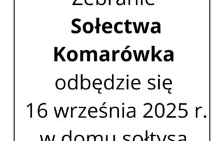 Informacja na temat zebrania sołeckiego – Zebranie Sołectwa Komarówka odbędzie się 16 września 2025 r. w domu sołtysa o godz. 17. Zapraszamy