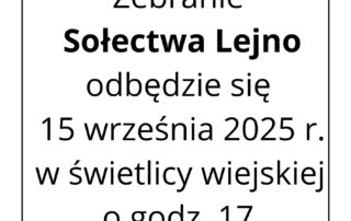 Informacja na temat zebrania sołeckiego – Zebranie Sołectwa Lejno odbędzie się 15 września 2025 r. w świetlicy wiejskiej o godz. 17. Zapraszamy