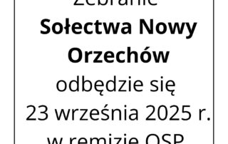 Informacja na temat zebrania sołeckiego – Zebranie Sołectwa Nowy Orzechów odbędzie się 23 września 2025 r. w remizie OSP o godz. 17. Zapraszamy