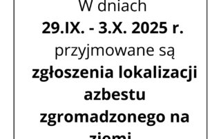W dniach 29.IX. - 3.X. 2025 r. przyjmowane są zgłoszenia lokalizacji azbestu zgromadzonego na ziemi. Poniżej dostępne są informacje oraz formularz. Azbest informacja(1) Zgłoszenie azbestu druk