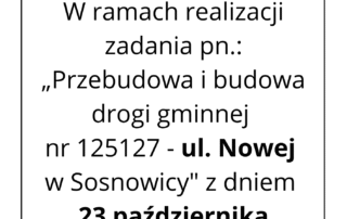 W ramach realizacji zadania pn.: „Przebudowa i budowa drogi gminnej nr 125127 - ul. Nowej w Sosnowicy" z dniem23 października zostanie wprowadzona stała organizacja ruchu.