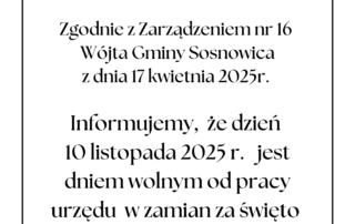 Zgodnie z Zarządzeniem nr 16 Wójta Gminy Sosnowica z dnia 17 kwietnia 2025r. Informujemy, że dzień 10 listopada 2025 r. jest dniem wolnym od pracy urzędu w zamian za święto 1 listopada 2025r. przypadające w [...]