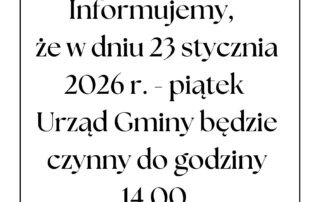 Informujemy, że w dniu 23 stycznia 2026 r. - piątek Urząd Gminy będzie czynny do godziny 14.00 Za utrudnienia przepraszamy.