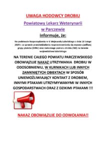Informacja Powiatowego Lekarza Weterynarii w Parczewie – wysoce zjadliwa grypa ptaków (HPAI) oraz rzekomy pomór drobiu (ND) na terenie województwa lubelskiegoRedaktor treści2026-02-23T15:09:44+01:0023 lutego, 2026|Aktualności| Załącznik:Rozporządzenie_Wojewody Lubelskiego_Nr 6_z 18.02.2026 w sprawie przeciwdziałania rozprzestrzenianiu się wysoce zjadliwej grypy ptaków (HPAI) oraz rzekomego pomoru drobiu (ND) na terenie województwa lubelskiego