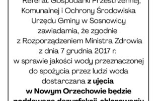 OGŁOSZENIE Referat Gospodarki Przestrzennej, Komunalnej i Ochrony Środowiska Urzędu Gminy w Sosnowicy zawiadamia, że zgodnie z Rozporządzeniem Ministra Zdrowia z dnia 7 grudnia 2017 r. w sprawie jakości wody przeznaczonej do spożycia przez ludzi woda [...]