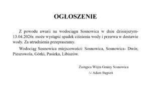 Ogłoszenie- przerwa w dostawie wody na wodociągu SosnowicaRedaktor treści2026-04-13T08:45:15+02:0013 kwietnia, 2026|Aktualności|