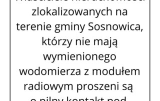 Właściciele nieruchomości zlokalizowanych na terenie gminy Sosnowica, którzy nie mają wymienionego wodomierza z modułem radiowym proszeni są o pilny kontakt pod nr tel. 881 – 155 - 858 w celu umówienia terminu wymiany.